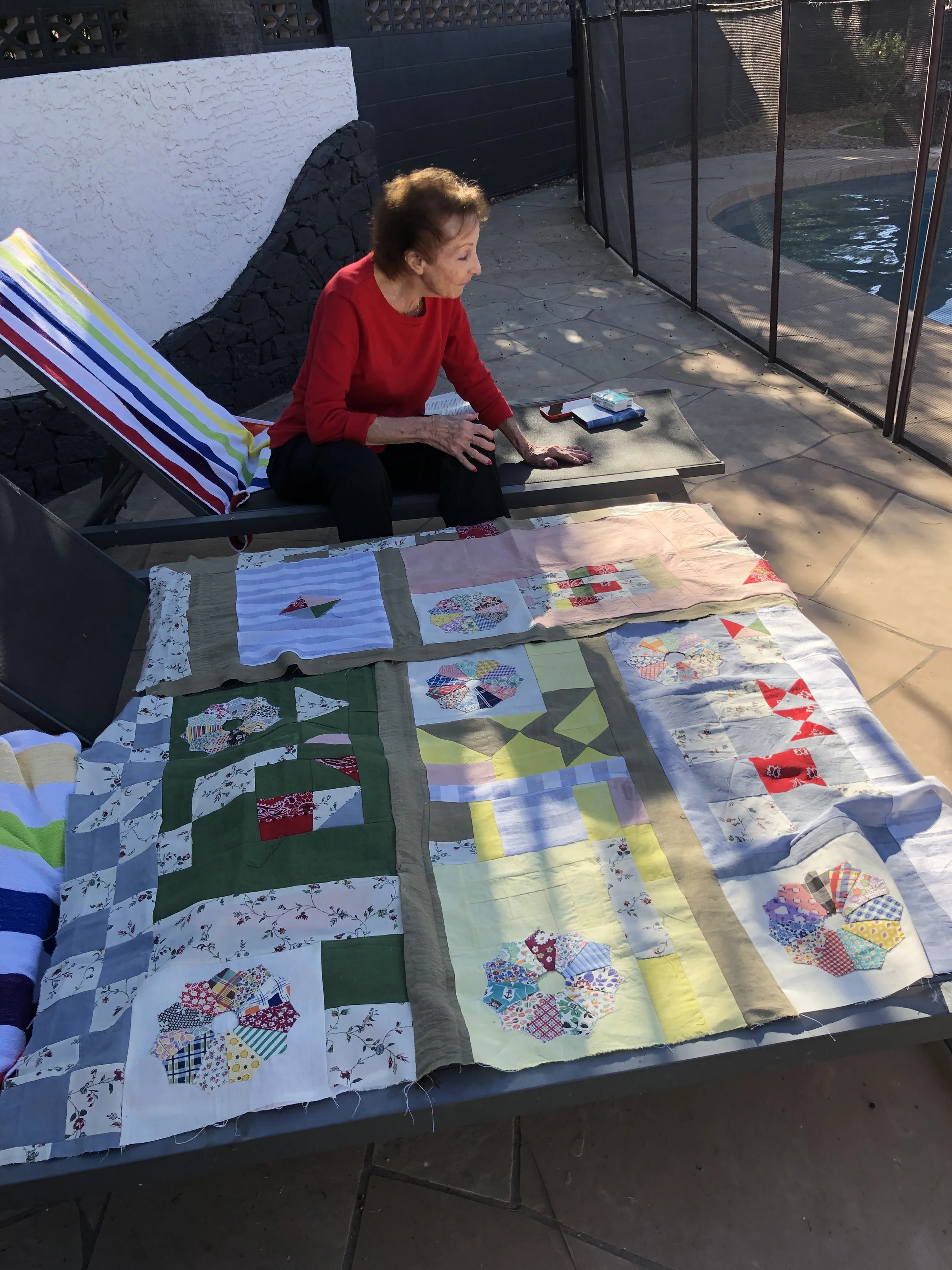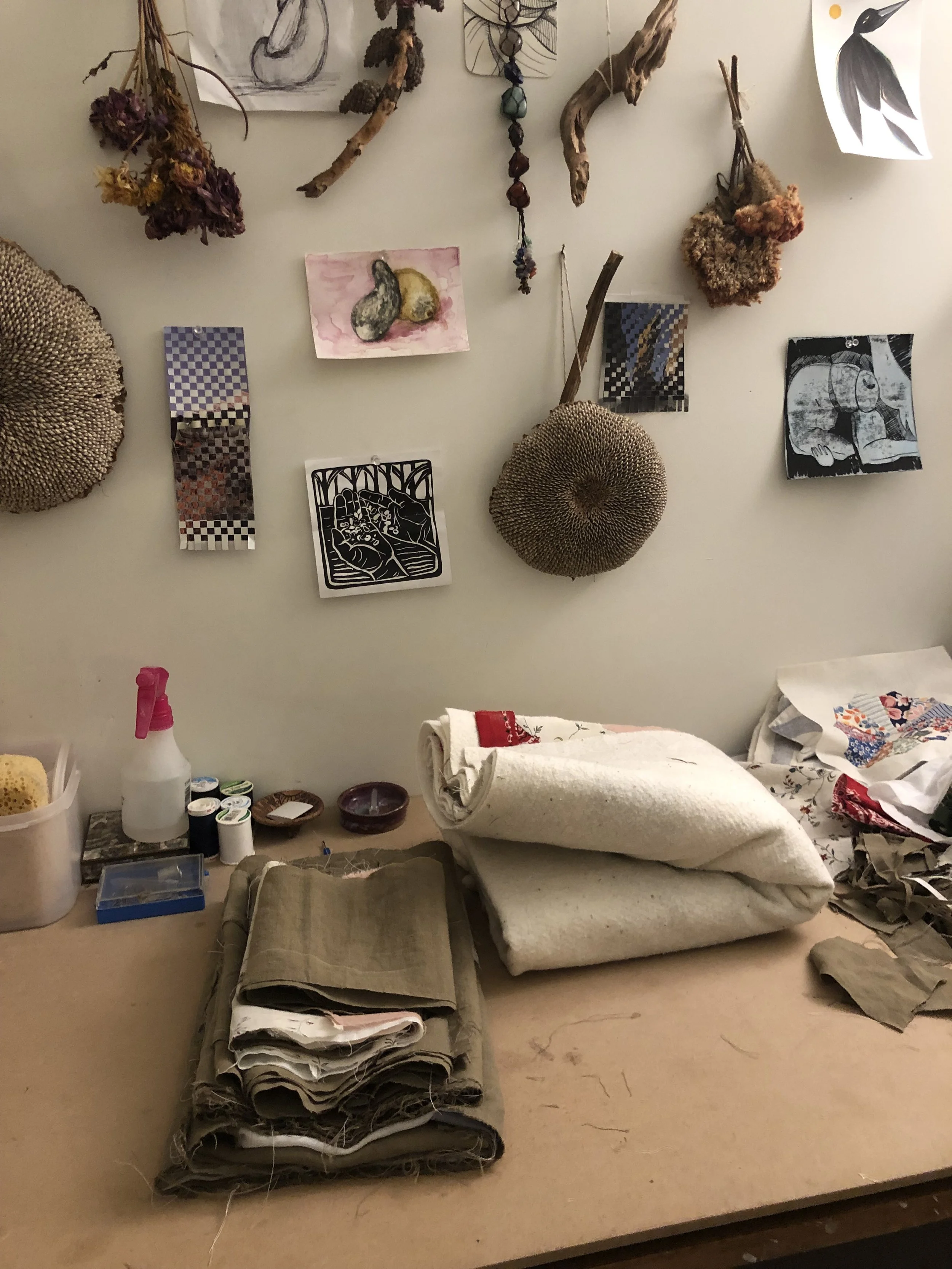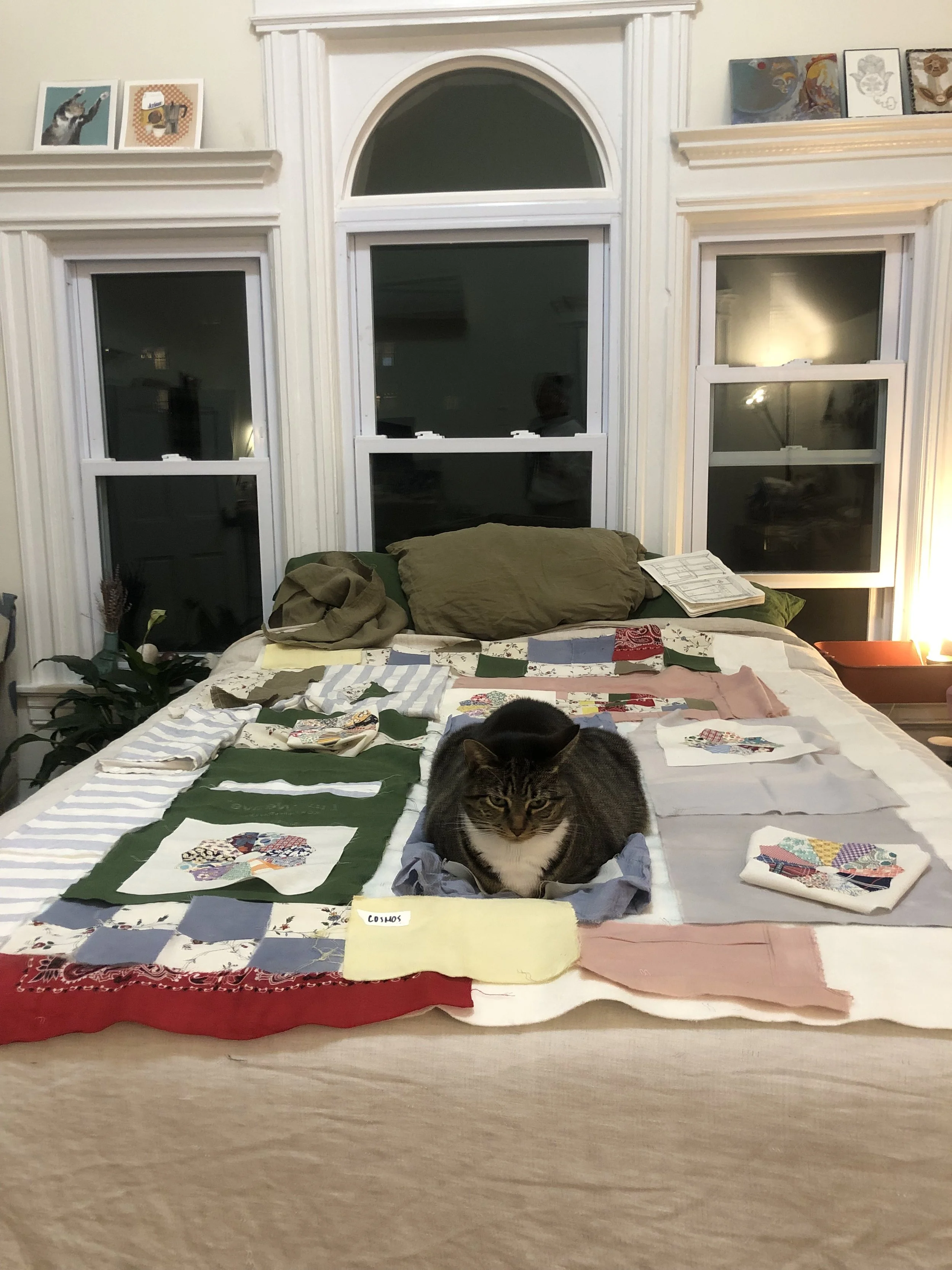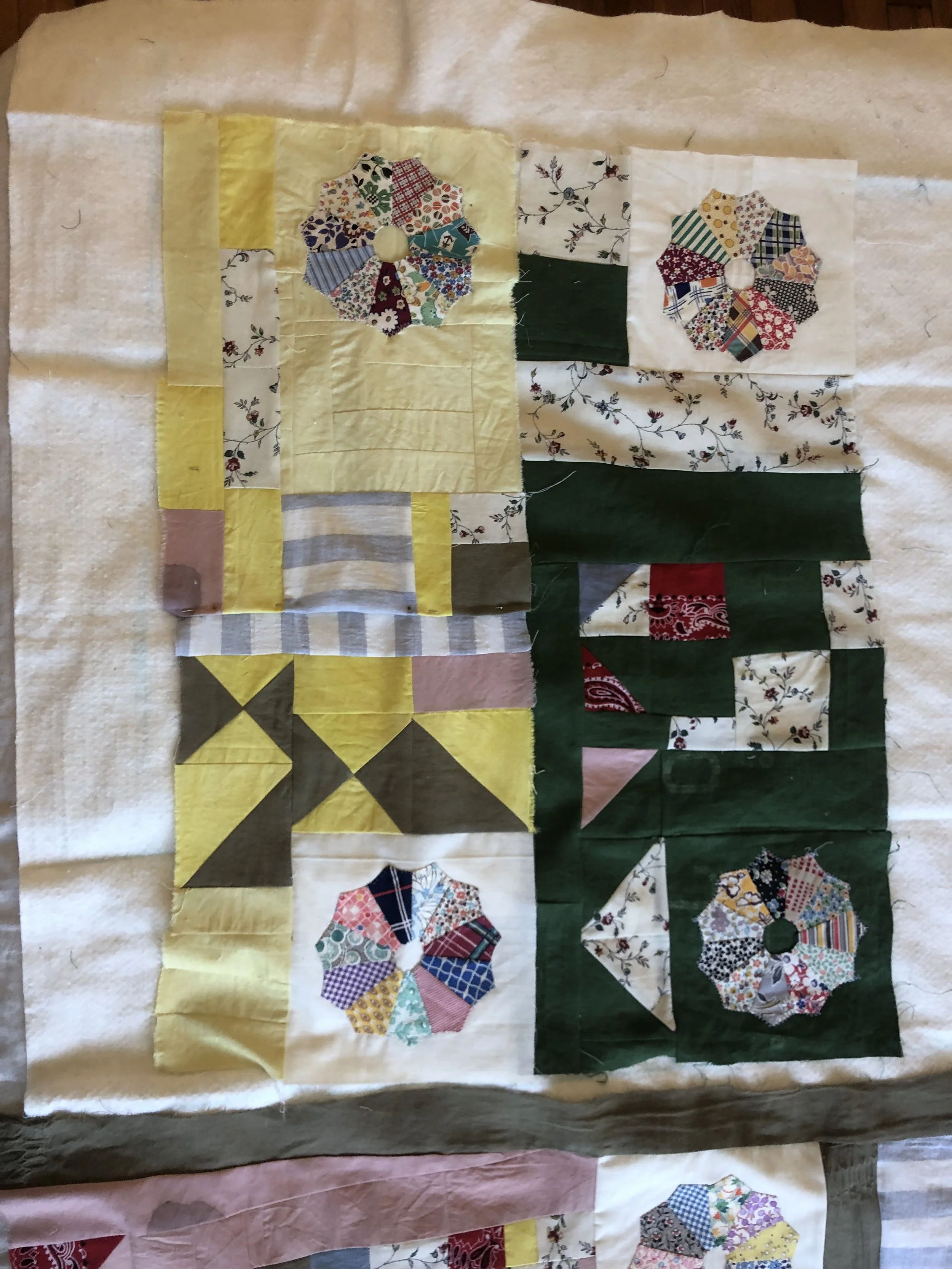 Quilting is an ancestral practice for me. My great-grandmother, Kathleen Cawthorne, was an accomplished quilter. We called her Nanny Cawthorne. Our time on this earth only briefly overlapped, so I did not get to know her well. I stumbled across a stack of about 30 hand-stitched Dresden plates that Nanny had started before she passed, tucked away in a drawer in my grandparent's house. These were pieces she started, pieces of her, tangible representations of her life force that persist even after her physical body has left this earth, sitting untouched and unvalued. It became the essence of this work to collaborate with my ancestors and breathe new life into otherwise discarded or forgotten objects. In addition to my great-grandmother's plates, all other fabrics are repurposed — old bedding, a stained shirt, a torn bandana, or second-hand fabrics that I hand-dyed with grown or foraged plants.